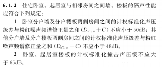 第6.1.2条规定,住宅卧室、起居室与相邻房间之间墙、楼板的隔声性能应符合下列规定:卧室分户墙及分户楼板两侧房间之间的计权标准化声压级差与粉红噪声频谱修正量 之和(DnT,w+C)不应小于50dB;其他分户墙及分户楼板两侧房间之间的计权标准化声压级差与粉红噪声频谱修正量之和(DnT,w+C)不应小于48dB;卧室、起居室楼板的计权标准化撞击声压级不应大于65dB。