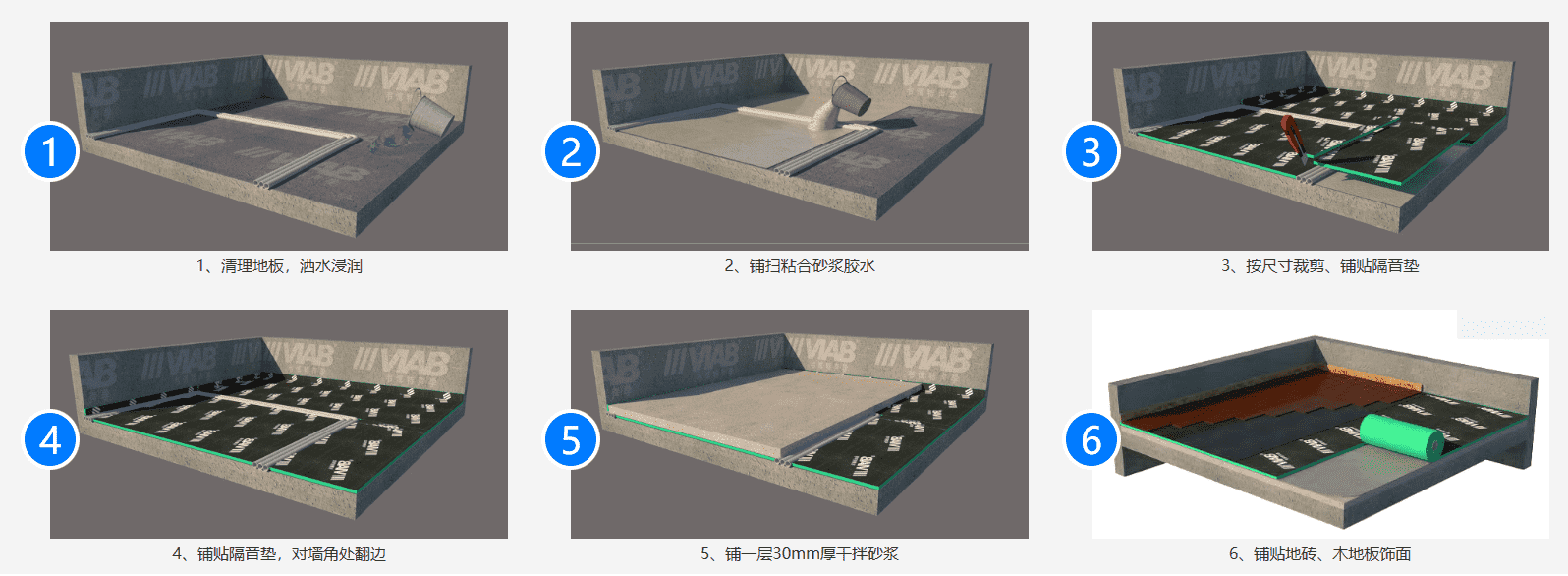 第三步:铺设隔音垫。采用平接方式,将隔音垫铺满地面。若铺设面层瓷砖地板,需在四周墙脚 20 - 30毫米 高的位置贴满减震垫,防止保护层地板与墙面形成声桥。